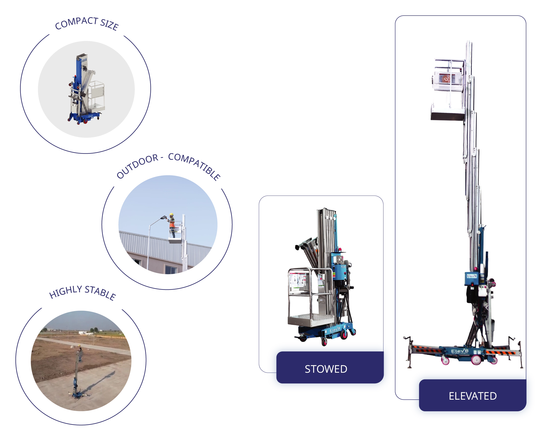 The VTL series, short for VERTICAL LIFT SERIES, is a push around machine that works on single mast technology. It runs a 12 V DC battery which makes it a very versatile machine. Some of the USPs of these types of machines include light weight for easy maneuverability, compact size for movement around tight spaces, one man operation, robust construction etc. There are five variants available in this series.